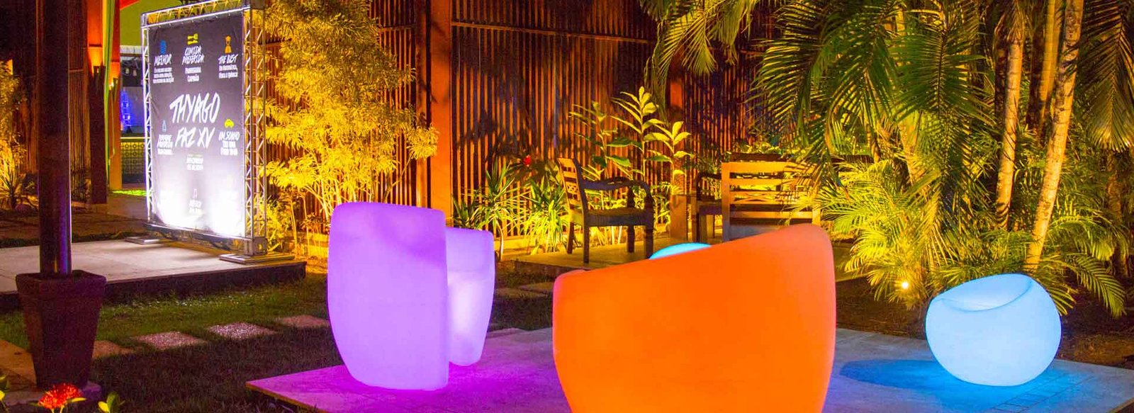 Hoje os mais usados são os puffs de led, que complementam as mesas neon, geralmente usamos uma mesa iluminada para quatro puffs, montando assim um pequeno lounge em sua festa.